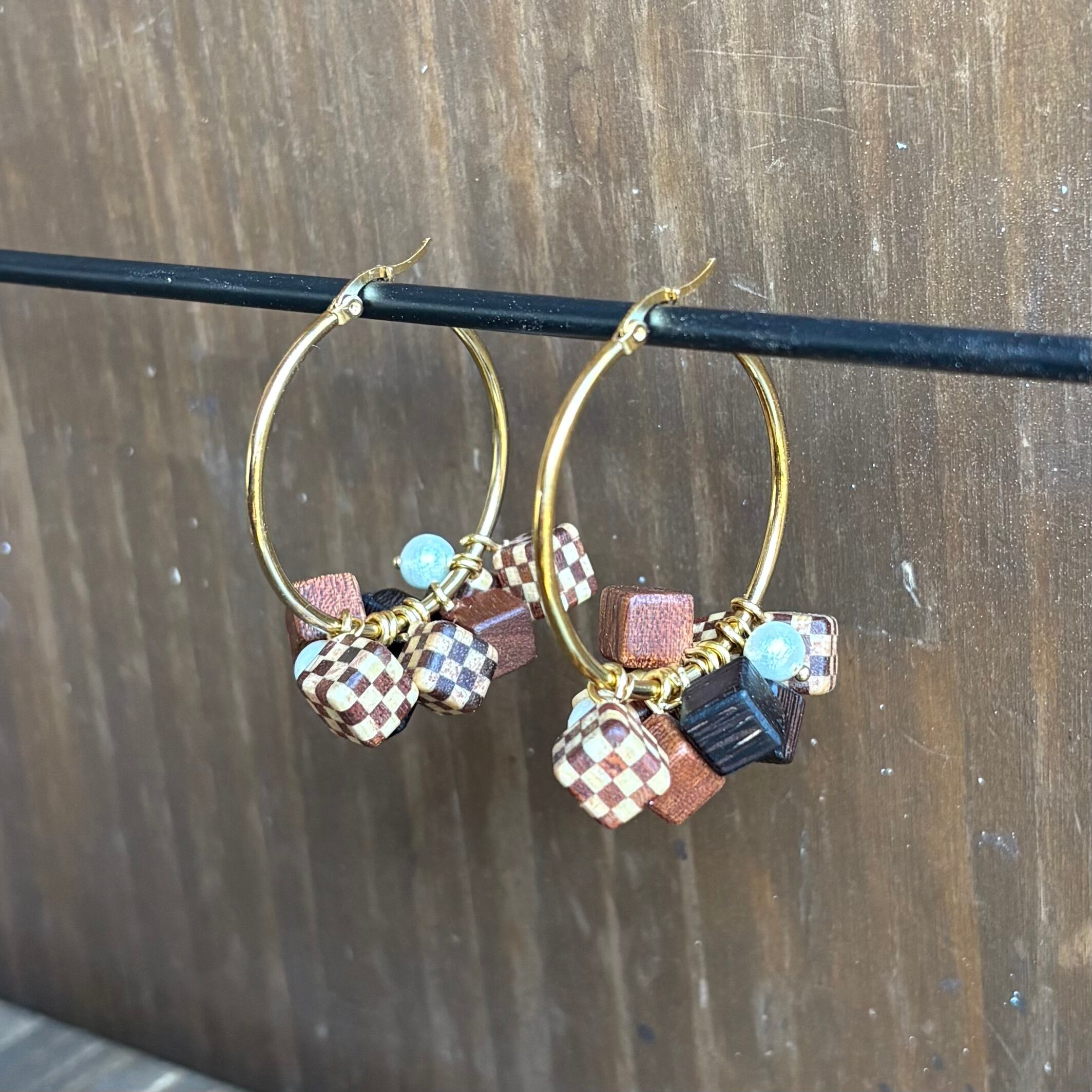 3種類の天然木を使用した寄木ピアスです
