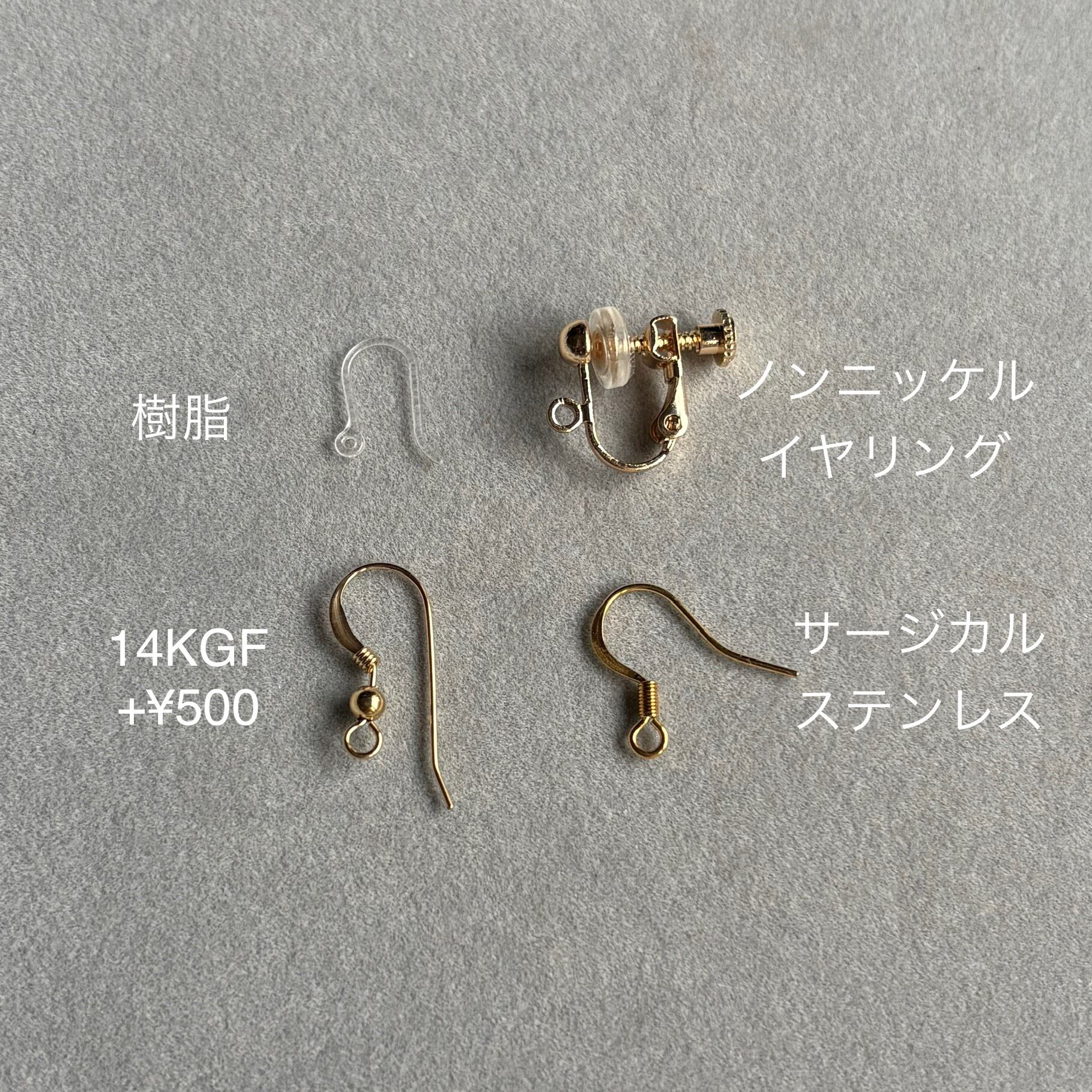 ※ピアスパーツは14KGF、サージカルステンレス、樹脂、ノンニッケルの物を使用していますが、全ての方にアレルギーが出ないことを保証するものではないことをご了承の上ご購入ください。